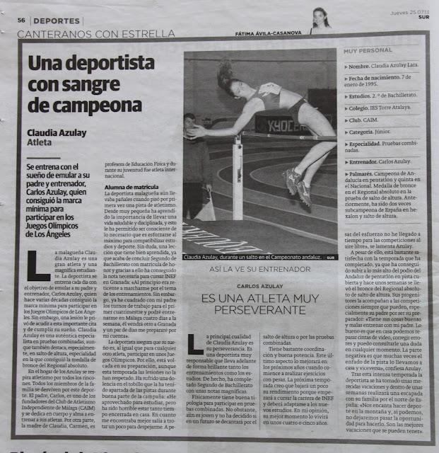 El jueves 25 de julio se publicó en el periódico Sur una entrevista a nuestra atleta junior Claudia Azulay donde nos cuenta sus inicios en el atletismo, los obstáculos que surgen por camino, el día a día de su preparación con su entrenador Carlos Azulay y sus proyectos deportivos para más adelante.