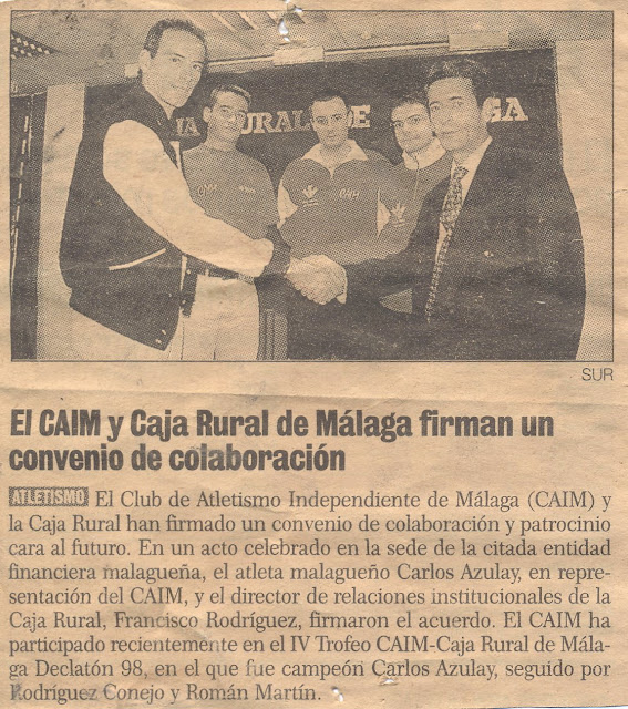 Noticia del periódico Sur del 08/10/1998. Firma de patrocinio de Caja Rural de Málaga (actual CajaMar) a Club de Atletismo Independiente Malagueño .En la foto (de izquierda a derecha): Carlos Azulay, Paco Soto, Miguel Lara, Arturo Rodríguez y Francisco Rodríguez.
