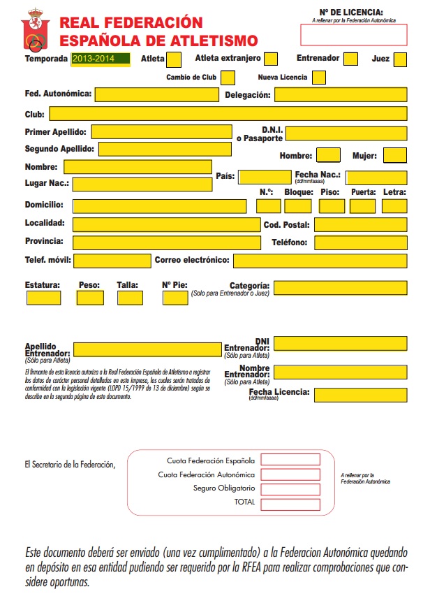 b) Para los nuevos atletas que van a solicitar por primera vez su licencia federativa nacional tendrán que descargar y rellenar el formulario que hay en la siguiente dirección de la RFEA: