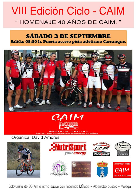 Nuestro directivo David Amores nos recuerda que el sábado 3 de septiembre de 2016 se va a celebra la VIII Ruta cicloturista del Club de Atletismo Independiente Malagueño con el tradicional recorrido desde Málaga capital hasta Algarrobo. Será un recorrido total de 85 km (ida y vuelta) con parada el el pueblo de Algarrobo donde los asistentes se reunirán para tomar un buen desayuno. Nos os paséis por si a la vuelta hay viento en contra.